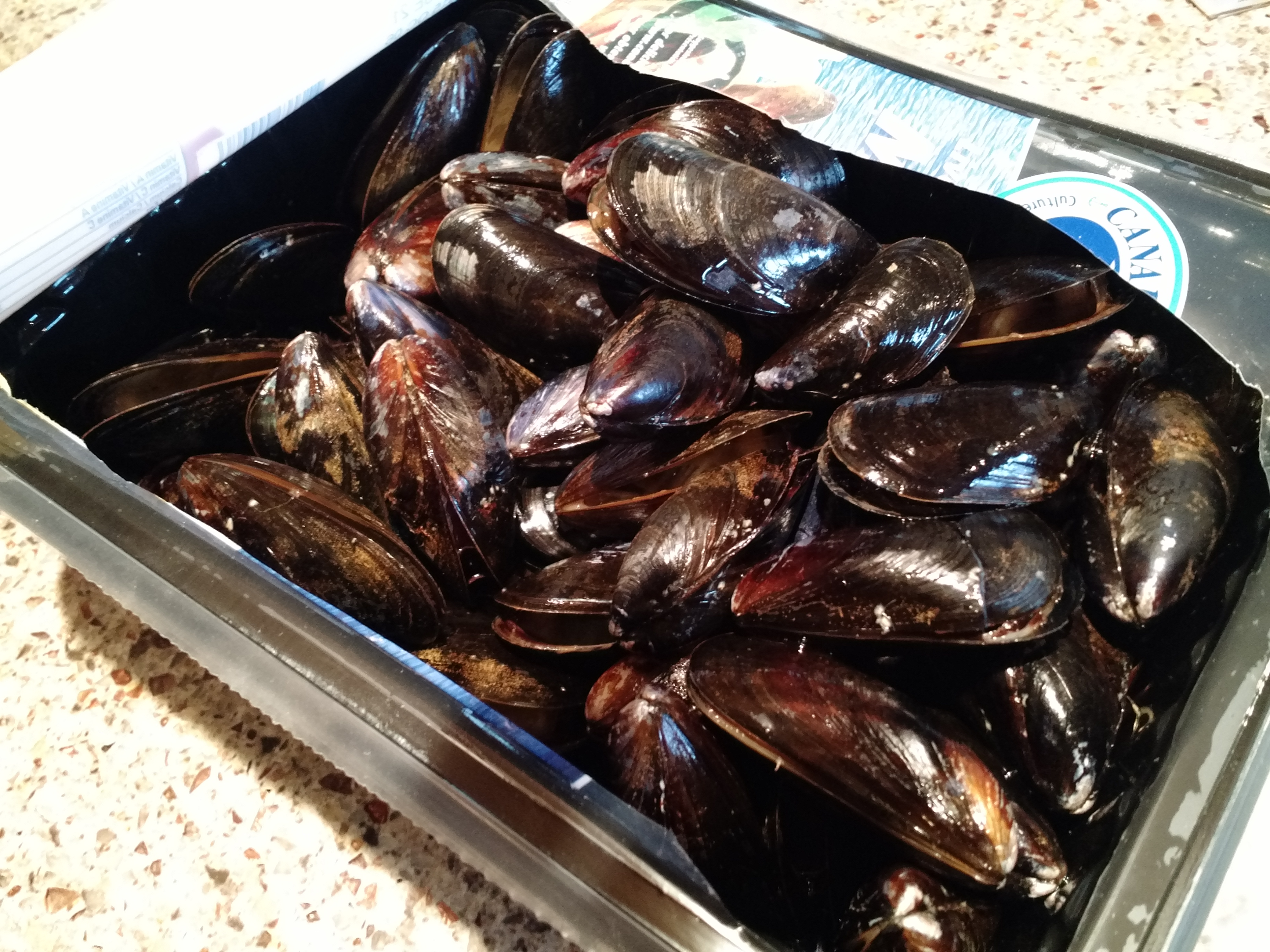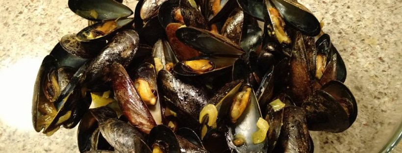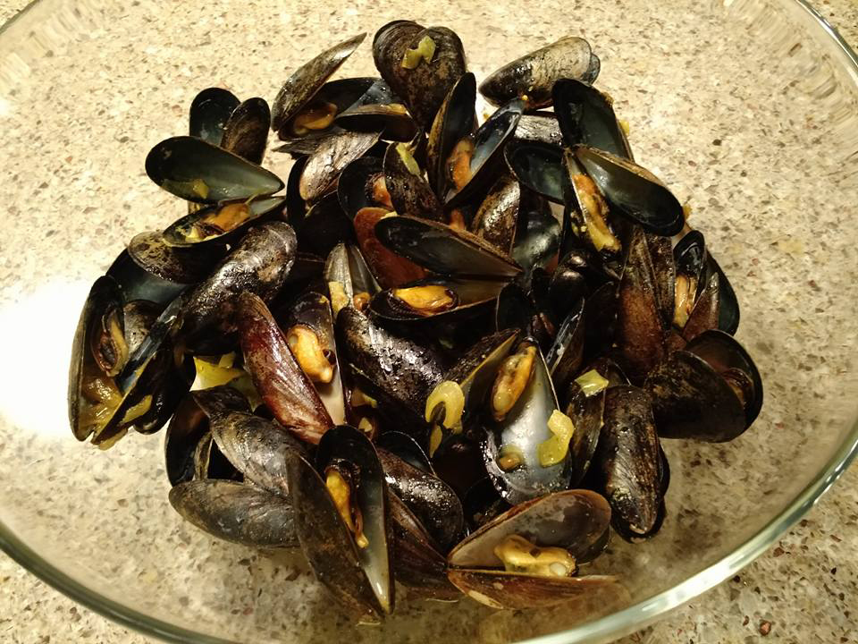 2 lbs fresh mussels (I used vacuum-sealed, and it worked out really well.  No debearding – removal of a thin, sticky membrane known as a ‘beard’ – or scrubbing required, although, I did rinse them in cool water.  If you do have to scrub and debeard, just Google it.  There are oodles of sites with instructions.)
