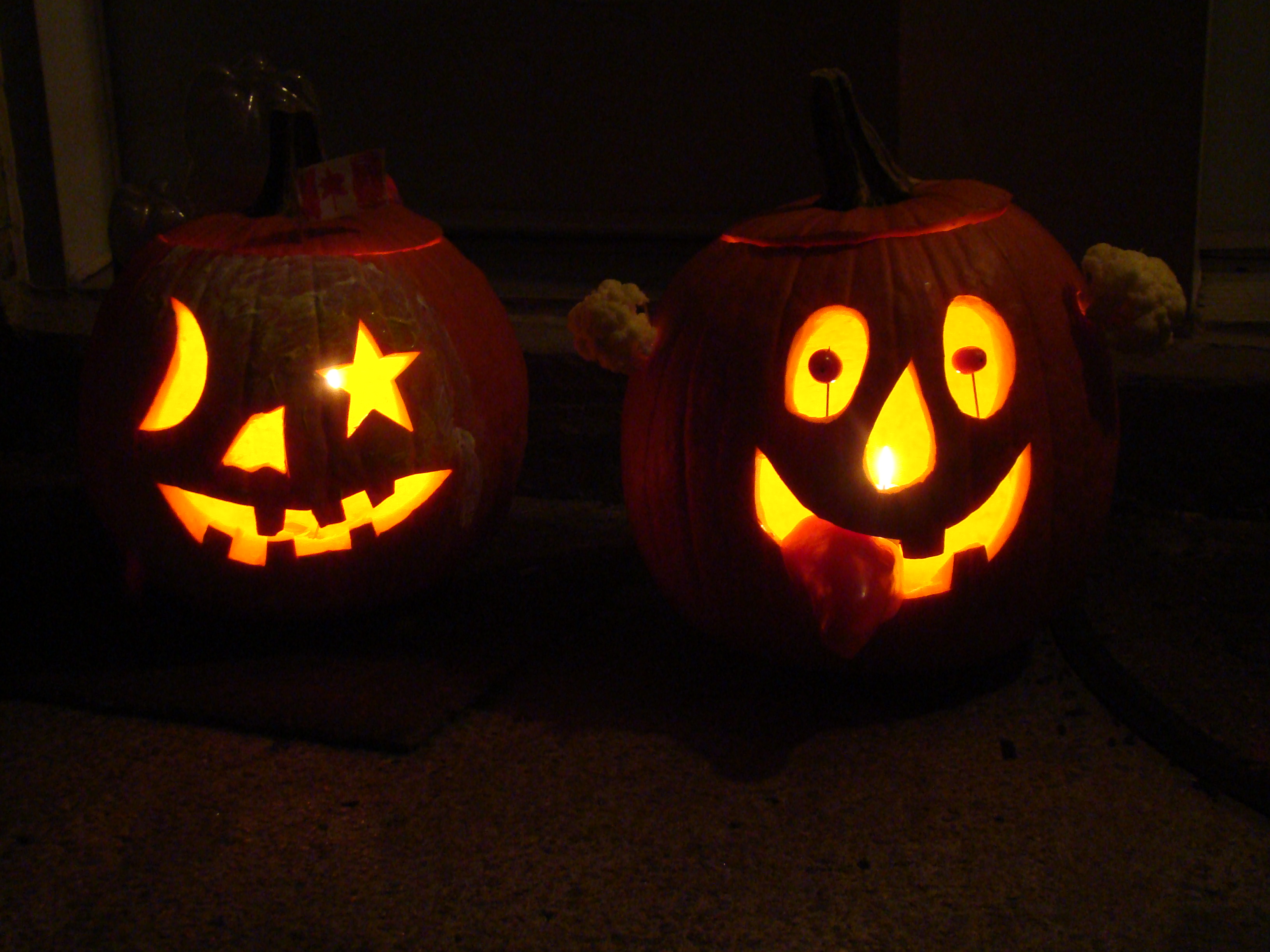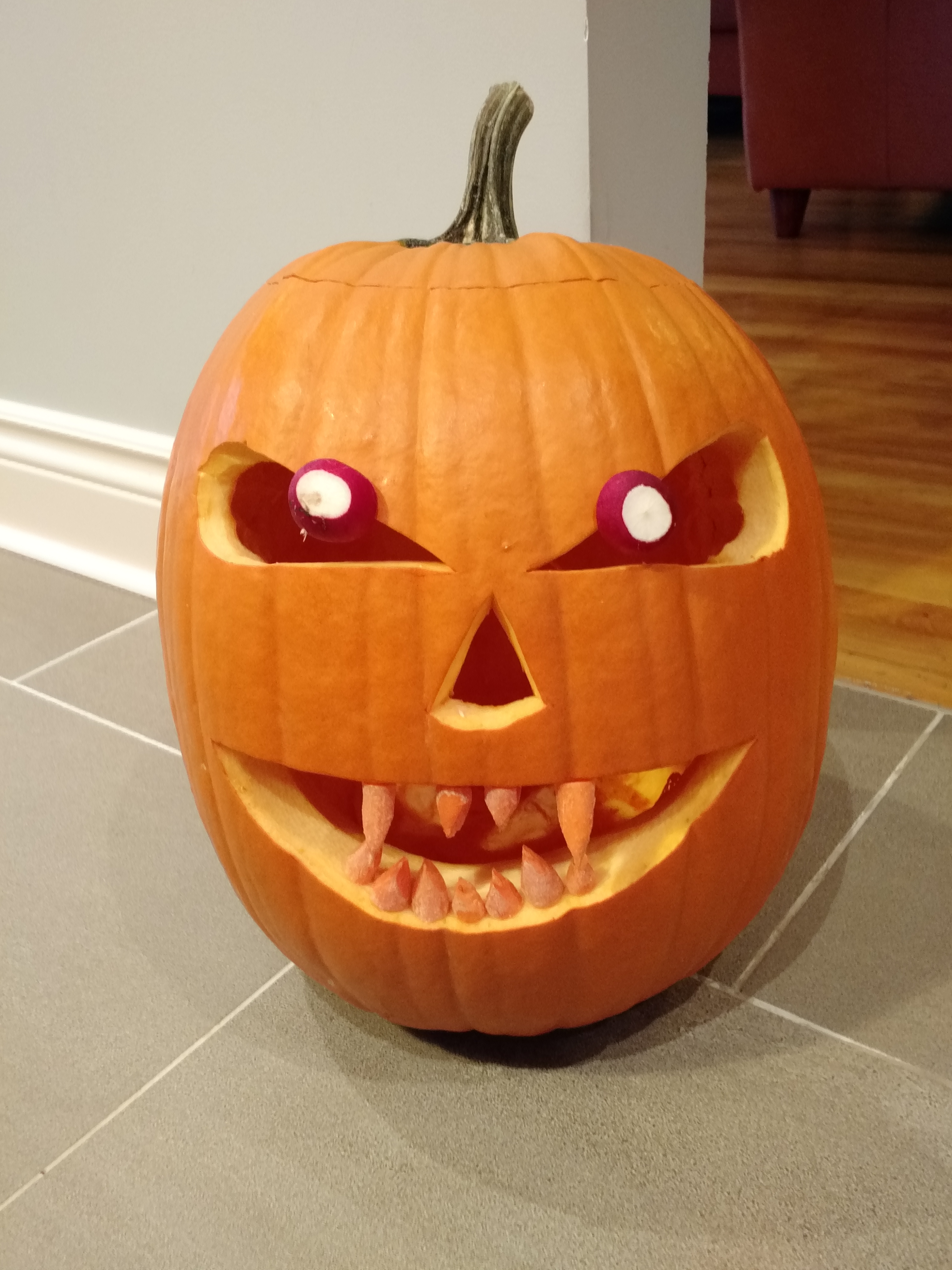 Yup, Halloween is just around the corner, so it will soon be time to select the perfect pumpkin to carve into a spooky jack-o-lantern for your front doorstep. If you’re looking to create something a bit more exotic than your standard carved out pumpkin, I thought I would share these pics. For the past two years, my boyfriend has designed some pretty unique jack-o-lanterns that have received many compliments from trick or treaters – small and large. By adding vegetables, he’s transformed a flat pumpkin face into a 3D character. Rather brilliant, I think, and our youngest still gets a huge kick out of the activity.