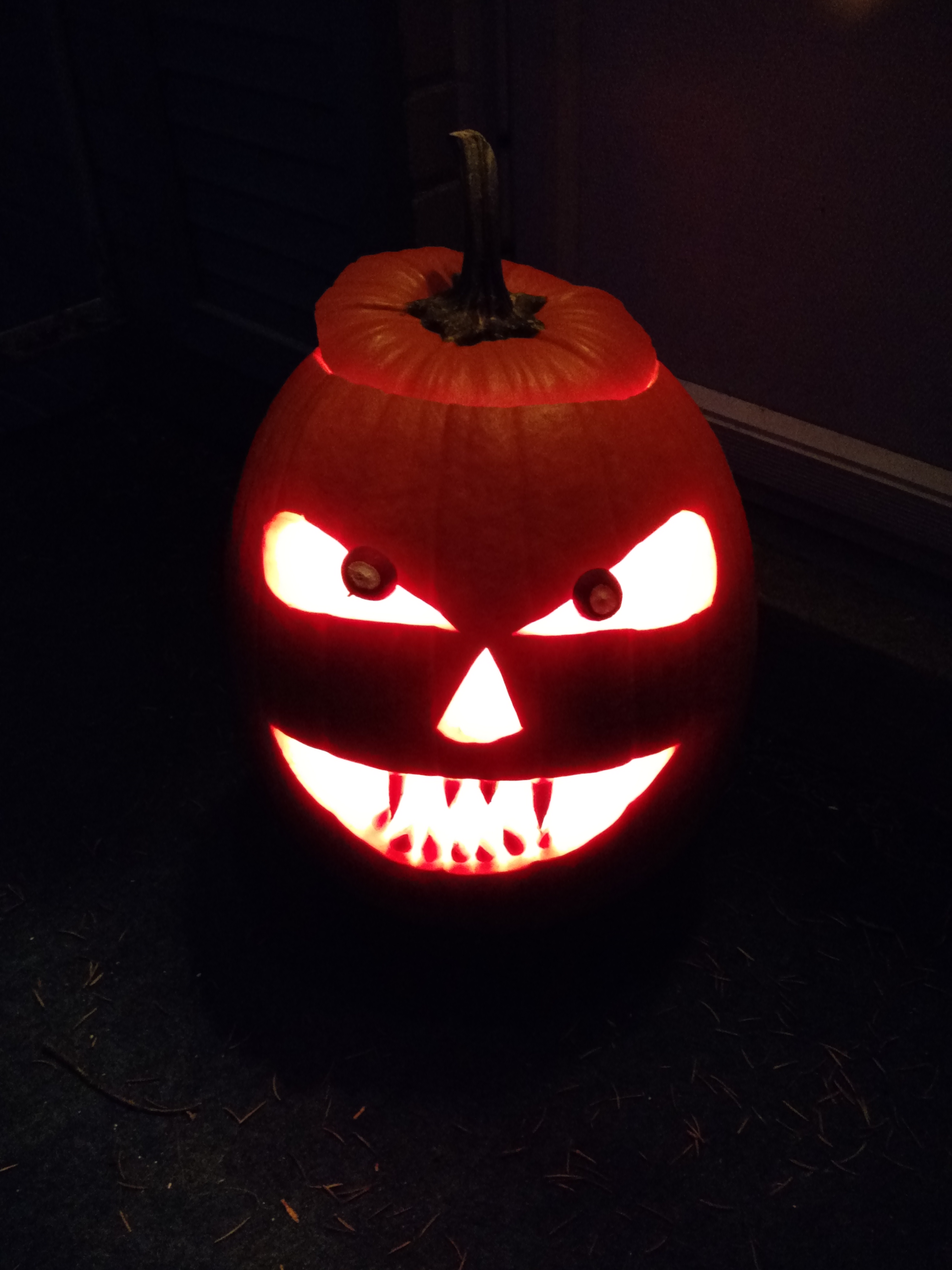 This year’s pumpkin was designed by my 13-year-old stepson. It’s pokemon-inspired and suitably frightening, I think 😉